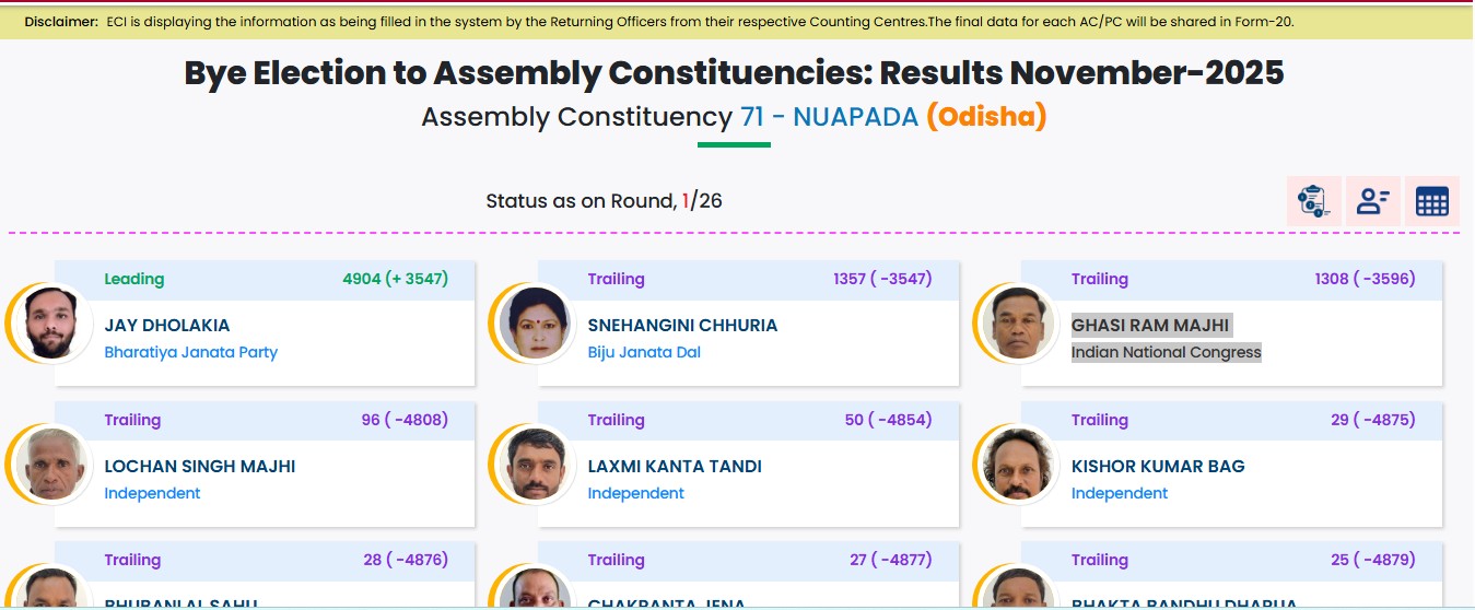 The Bharatiya Janata Party (BJP) is dominating the early count for the Nuapada Assembly by-election in Odisha. BJP candidate Jay Dholakia is currently ahead by a margin of 3,547 votes. The leading candidate is significantly ahead of the Biju Janata Dal (BJD)'s Snehangini Chhuria and the Congress party's Ghasi Ram Majhi, both of whom are trailing in the initial rounds.