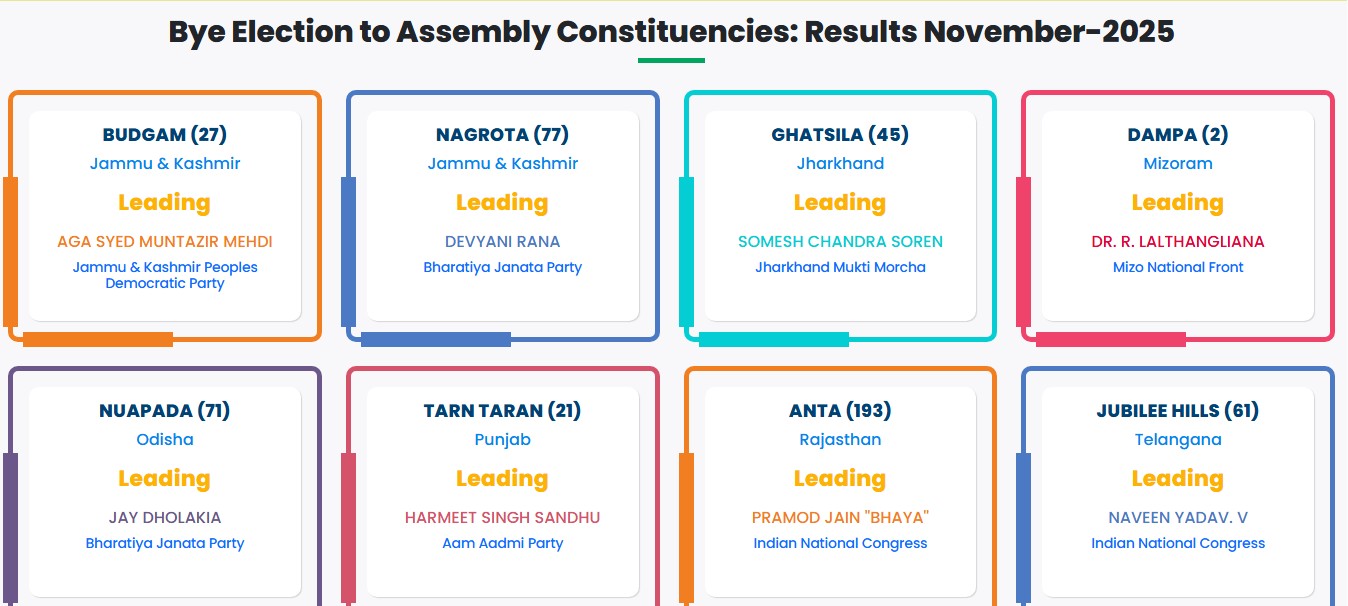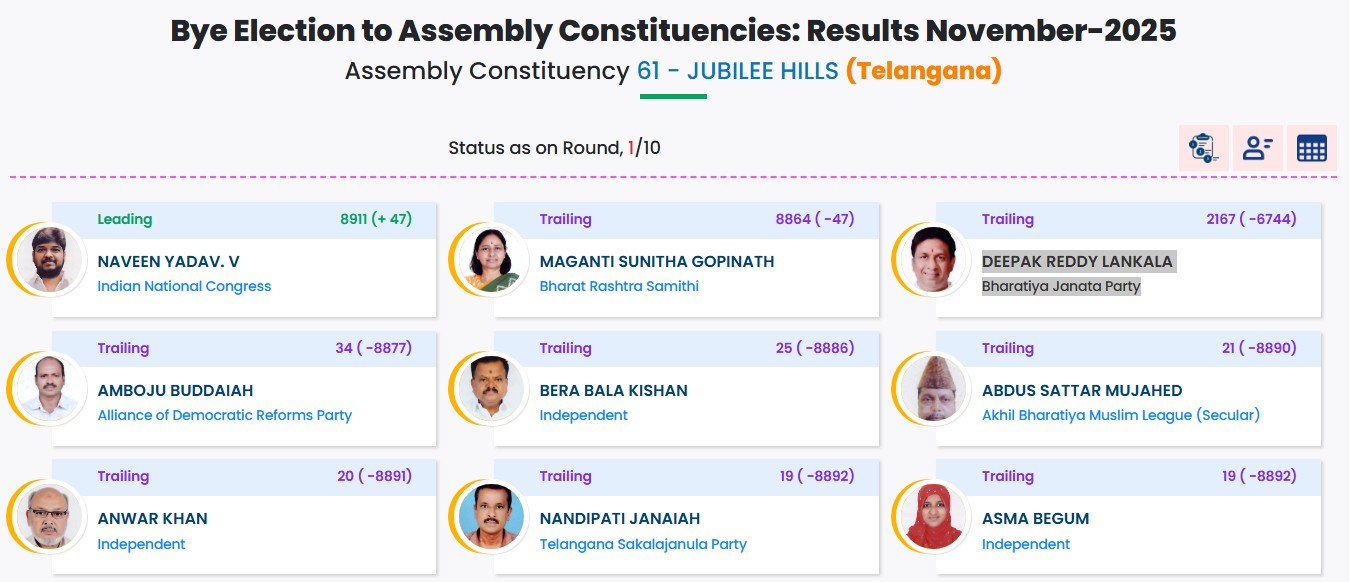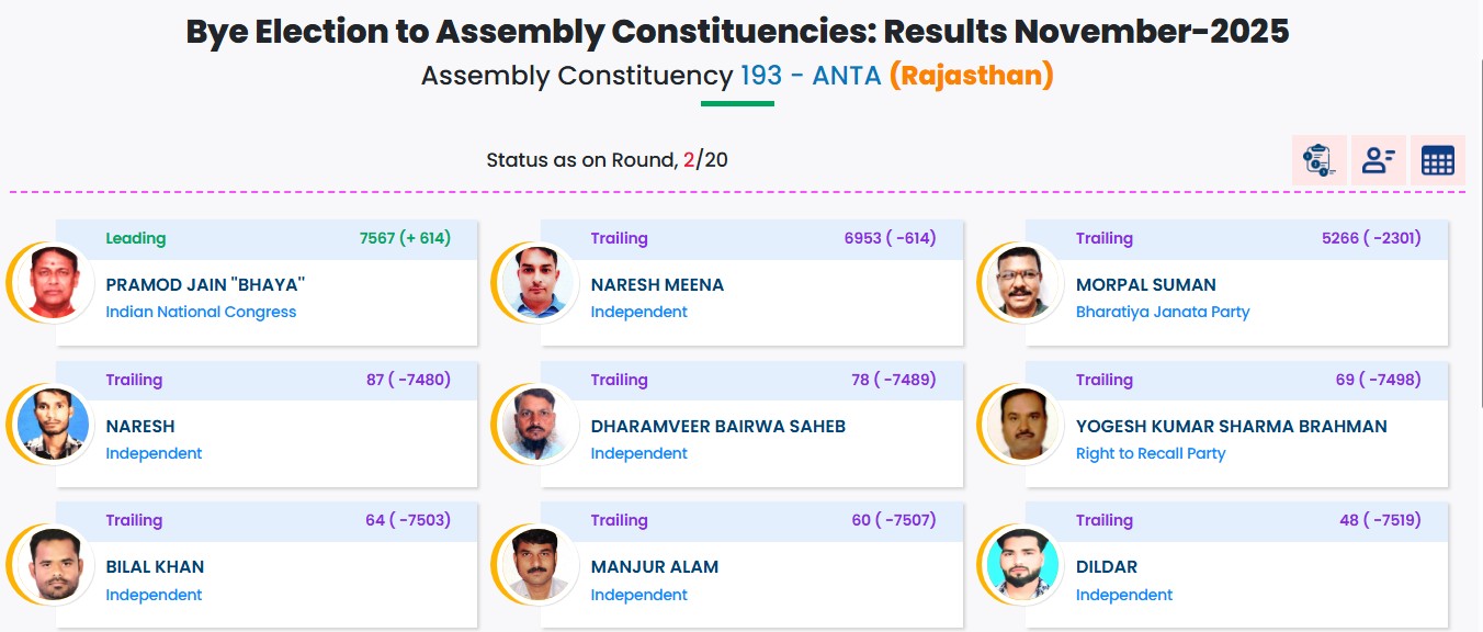 The Congress party is leading in its two major contests. In Telangana's Jubilee Hills, Congress candidate Naveen Yadav holds a lead of 12,859 votes. In Rajasthan's Anta, Pramod Jain of the Congress is also ahead by 7,171 votes.