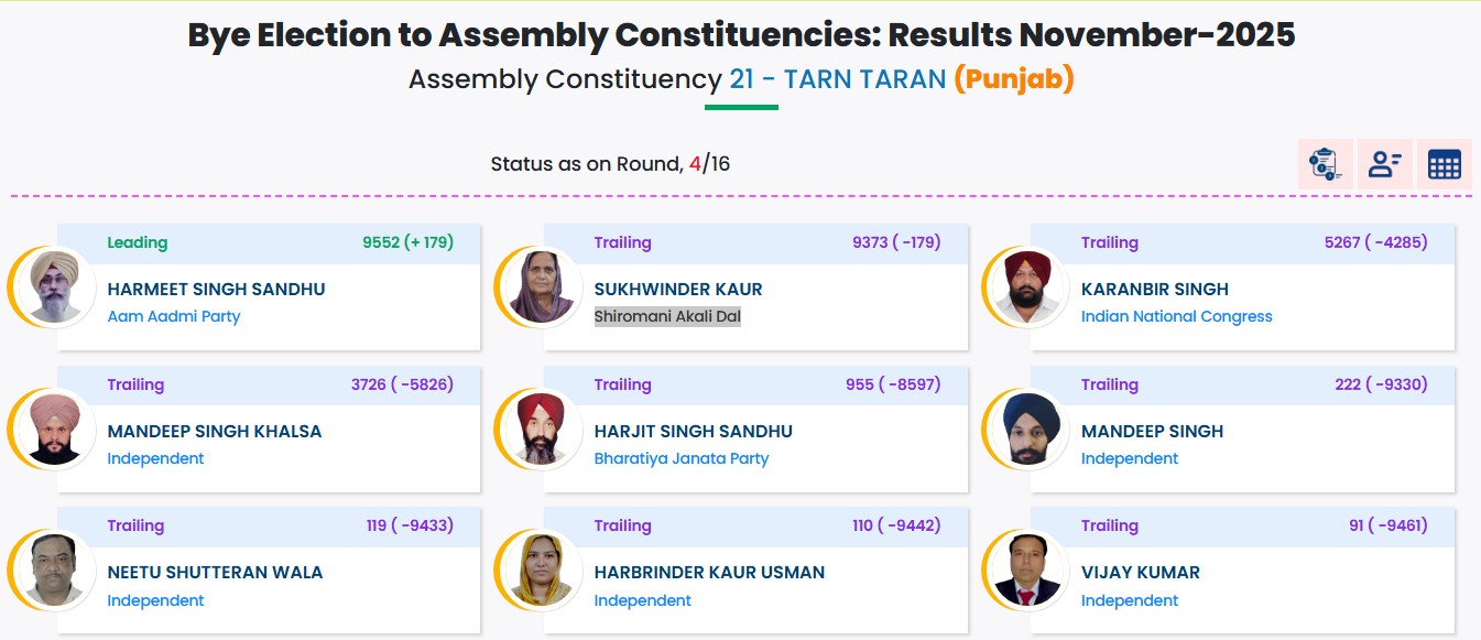 The counting of votes for the Tarn Taran assembly bypoll is witnessing a close contest, with the ruling Aam Aadmi Party (AAP) candidate, Harmeet Singh Sandhu, gaining a narrow lead. Sandhu is currently ahead by 179 votes, overturning an earlier lead held by Shiromani Akali Dal's (SAD) Sukhwinder Kaur.