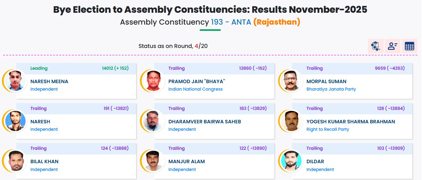 Independent candidate Naresh Meena has achieved a significant turnaround in the ongoing counting for Rajasthan's Anta Assembly by-election, moving into the lead with a margin of 152 votes. This shift places Congress's Pramod Jain and BJP's Morpal Suman behind in the count. Initial trends had favoured the Congress candidate, Pramod Jain.