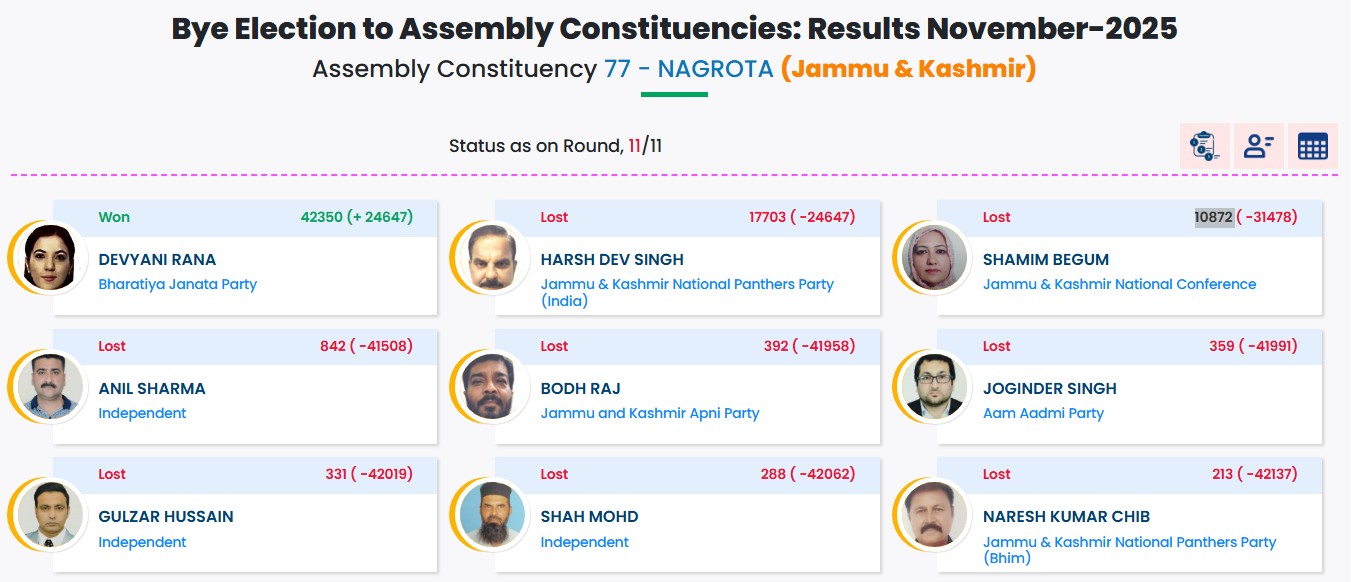 BJP's Devyani Rana won in Jammu and Kashmir's Nagrota by defeating Jammu & Kashmir National Panthers Party's Harsh Dev Singh and Jammu & Kashmir National Conference's Shamin Begum by a margin of 42,350 votes.