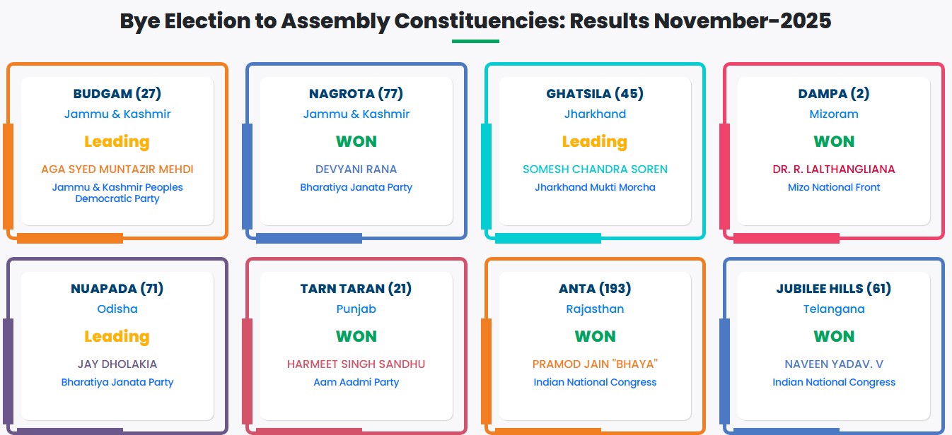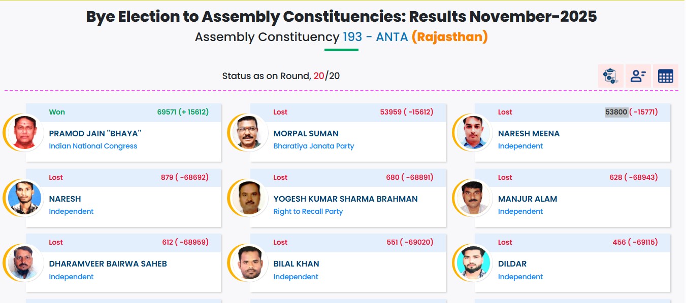 The Congress party registered crucial wins in two separate states. In Rajasthan's Anta, Pramod Jain "Bhaya" defeated the BJP's Morpal Suman and Independent Naresh Meena, securing 69,571 votes and winning by a margin of 15,612 votes. The party also celebrated a victory in the Telangana's Jubilee Hills by-poll, where Naveen Yadav was declared the winner.