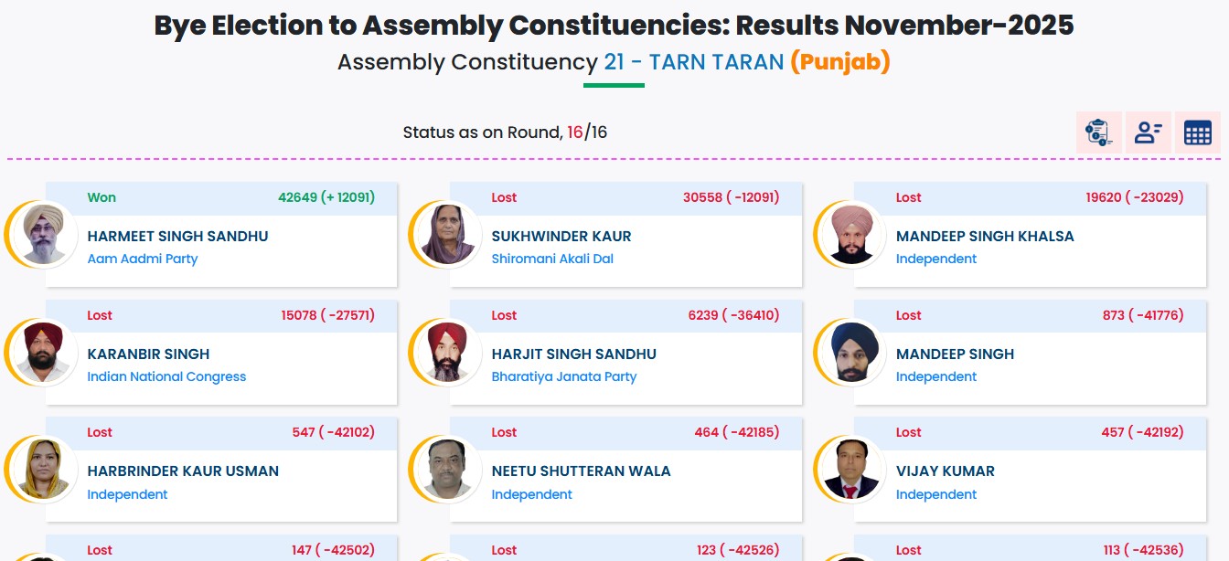 AAP's Harmeet Singh Sandhu defeated Shiromani Akali Dal's Sukhwinder Kaur by 12,091 votes. Independent candidate Mandeep Singh Khalsa, Congress's Karanbir Singh and BJP's Harjit Singh Sandhu also lost in Punjab's Tarn Taran Assembly bypolls.