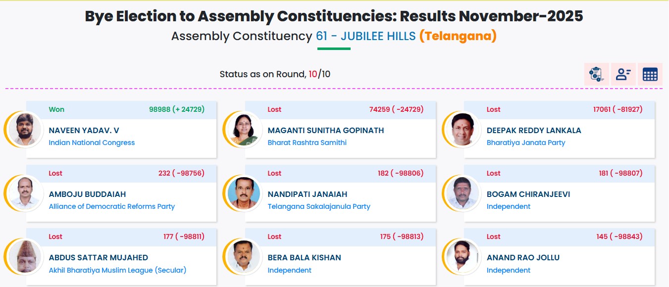 Naveen Yadav of Congress won in Telangana's Jubilee Hills assembly bypolls by 24,729. He defeated Bharat Rashtra Samithi's Maganti Sunitha Gopinath and BJP's Deepak Reddy Lankala.