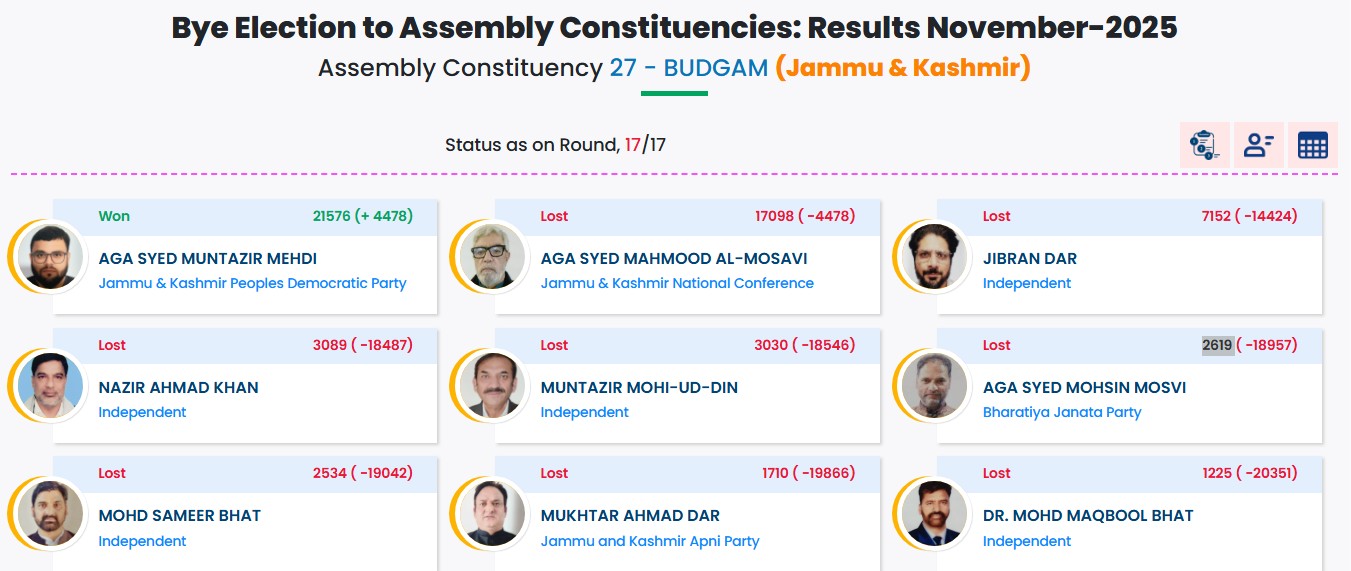 This development places the earlier frontrunner, Aga Syed Mahmood Al-Mosavi of the Jammu & Kashmir National Conference (NC), and the independent candidate Nazir Ahmad Khan, into trailing positions.