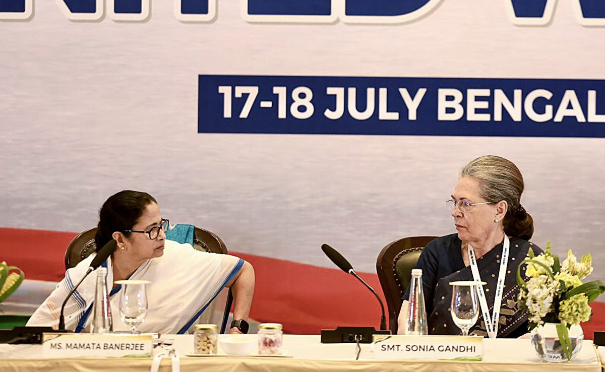 Bengal Chief Minister Mamata Banerjee and Congress Parliamentary Party chairperson Sonia Gandhi shared moments together, inquiring about each other's health and strategising on opposition unity on the first day of the Bengaluru meet, sources told PTI.
