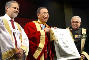UN Secretary-General Ban Ki-moon was on Friday conferred an honorary degree of doctor of letters at Jamia Millia Islamia. Mr Ban Ki Moon expressed his fondness for India saying that "when I am in India, I am at home".
