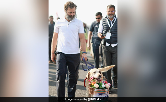 The dogs, Lizho and Rexy, held a basket of bouquets with the messages "Chale Kadam, Jude Vatan" and "Nafrat Chhodo, Bharat Jodo," and handed it over to Gandhi.