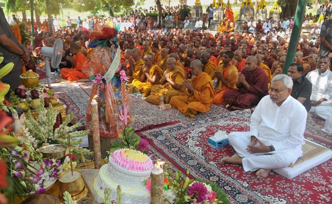 Bihar Chief Minister Nitish Kumar offering prayers at Mahabodhi Temple in Bodhgya on Monday. (Press Trust of India)
