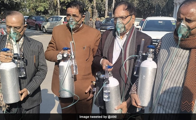 The three-day session of the Delhi assembly began on Monday with BJP MLAs carrying oxygen cylinders inside the House to protest against alleged inaction of the AAP government to prevent air pollution.