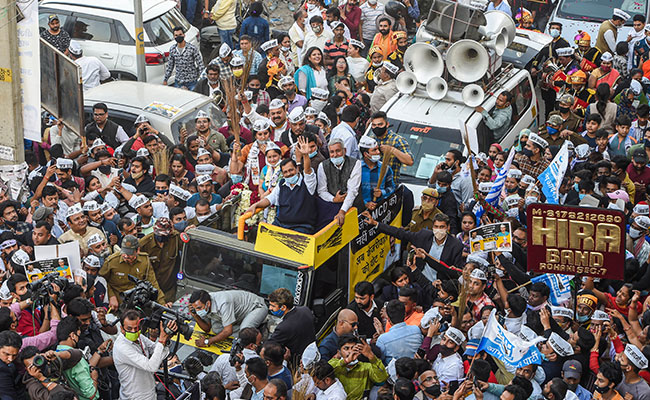 Thousands carrying Aam Aadmi Party flags and banners of Kejriwal gathered at Chandrawal road as the chief minister held a roadshow in the area ahead of the upcoming municipal elections in Delhi. Many sang and danced to drumbeats.