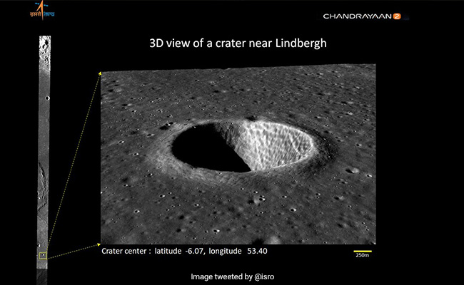 "Have a look of 3D view of a crater imaged by TMC-2 of #Chandrayaan2. TMC-2 provides images at 5m spatial resolution & stereo triplets (fore, nadir and aft views) for preparing DEM of the complete lunar surface," ISRO tweeted from its official handle.