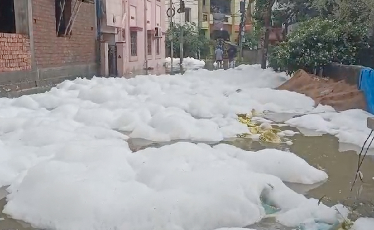 Locals said that sewer passing beside the colonies got mixed with chemical waste from the industries nearby and the foam was formed by the rainwater reacting to the chemicals.