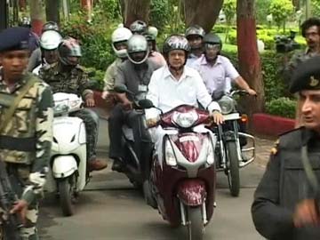 Chhattisgarh Chief Minister Raman Singh rides a scooter to promote road safety.