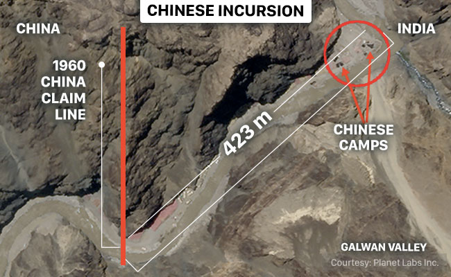 China's forces in the Galwan Valley have intruded 423 metres into Indian territory, an incursion which seems to be well ahead of Beijing's own 1960 Claim Line in the region.