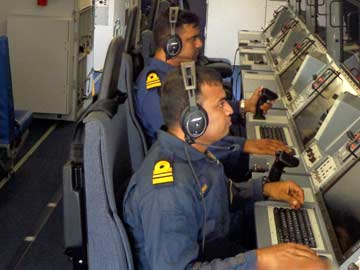 Indian Navy officers inside a P-8I maritime surveillance aircraft over Bay of Bengal in search of the missing Malaysian airliner on March 15, 2014. (File photo)