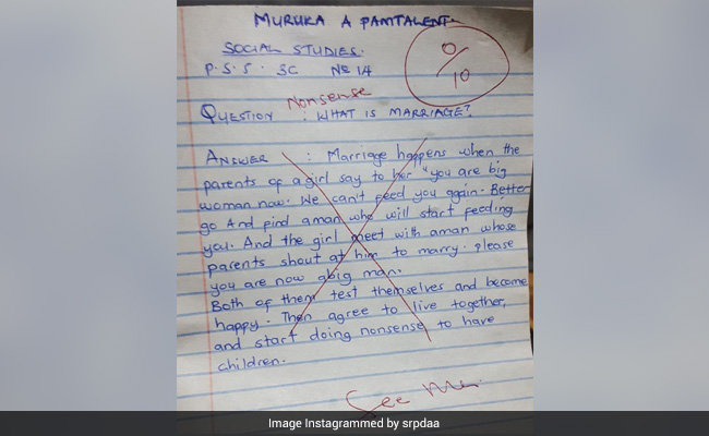 The student was asked to write on the topic “what is marriage?” as a part of the social studies examination. It seemed the teacher was not happy with the answer and the student got zero out of 10. Not just that, the teacher crossed out the text with a red pen and asked the student to "see me". Now, a picture of the answer script has gone viral on social media.