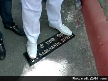 After Railways Minister Sadananda Gowda presented his budget in Parliament today, Congress workers vandalized his home, pulling down his name plate from the gate and standing on it. They also tried to block the minister's car from entering his residence. (See Pictures)