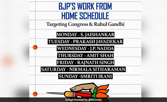 A dash of humour was added today in the bitter war of words between the Congress and the BJP over Coronavirus, China, Rajasthan and lately Uttar Pradesh law and order, which had Twitter in splits. "Who's on duty today" vis-a-vis targetting the Congress and Rahul Gandhi, the Congress questioned, posting a mock "Work From Home" schedule where various Union ministers were seen rostered.