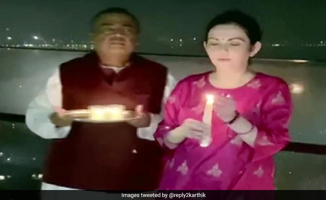 The Ambani couple - Mukesh and his wife Neeta - switched off lights at their palatial house as the clock struck 9 pm on Sunday and they were seen holding diyas and candles as some shlokas played in the background.