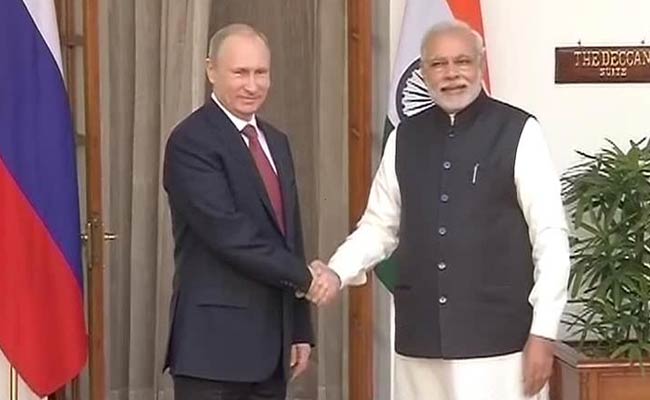 PM Narendra Modi meets Russian President Vladimir Putin at Hyderabad House in New Delhi.