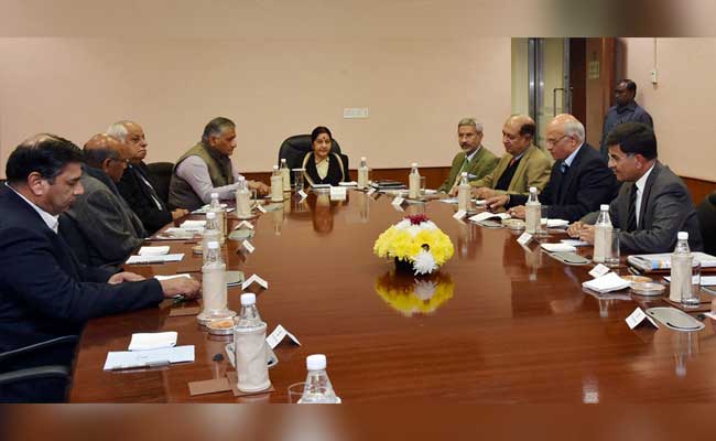 External Affairs Minister Sushma Swaraj and MoS V K Singh in a meeting with former ambassadors to Pakistan and foreign secretaries in New Delhi on Sunday. (PTI picture)