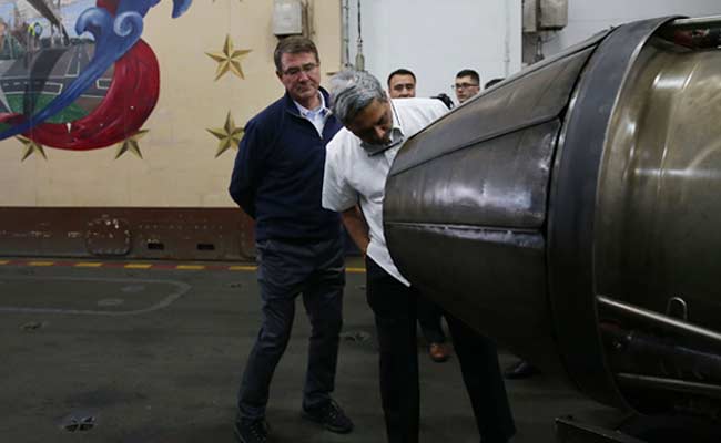 US Defense Secretary Ashton Carter (L) and Defence Minister Manohar Parrikar inspect a jet engine in the hanger deck of the USS Eisenhower. (Reuters Photo)