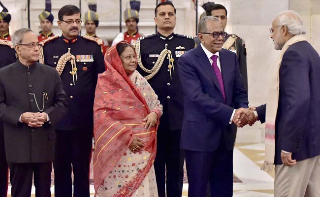 Prime Minister Narendra Modi greets Bangladeshi President Abdul Hamid at a banquet at Rashtrapati Bhavan. Also seen are President Pranab Mukherjee and Bangladesh First Lady Rashida Khanam. (Press Trust of India)