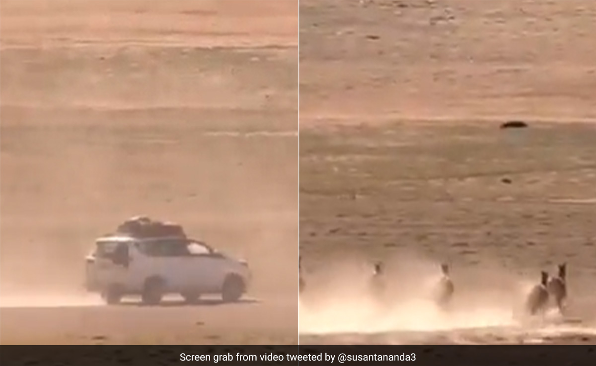 In the 15-second video, a car can be seen overspeeding and chasing a group of wild asses who are swiftly seen running away from the vehicle. At least six to seven wild asses are seen desperately trying to get away from the speeding car.
