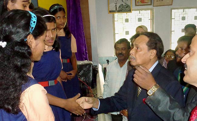 Former Bangladesh President Hussain Mohammad Ershad interacting with blind students at a government school in Coochbehar district of West Bengal on Thursday, December 10, 2015. (Press Trust of India photo)