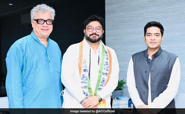 In photos tweeted by the Trinamool today, Mr Supriyo, flanked by party leaders Abhishek Banerjee and Derek O'Brien, wearing a scarf adorned with the party's election symbol is seen smiling and shaking hands with Mr Banerjee.