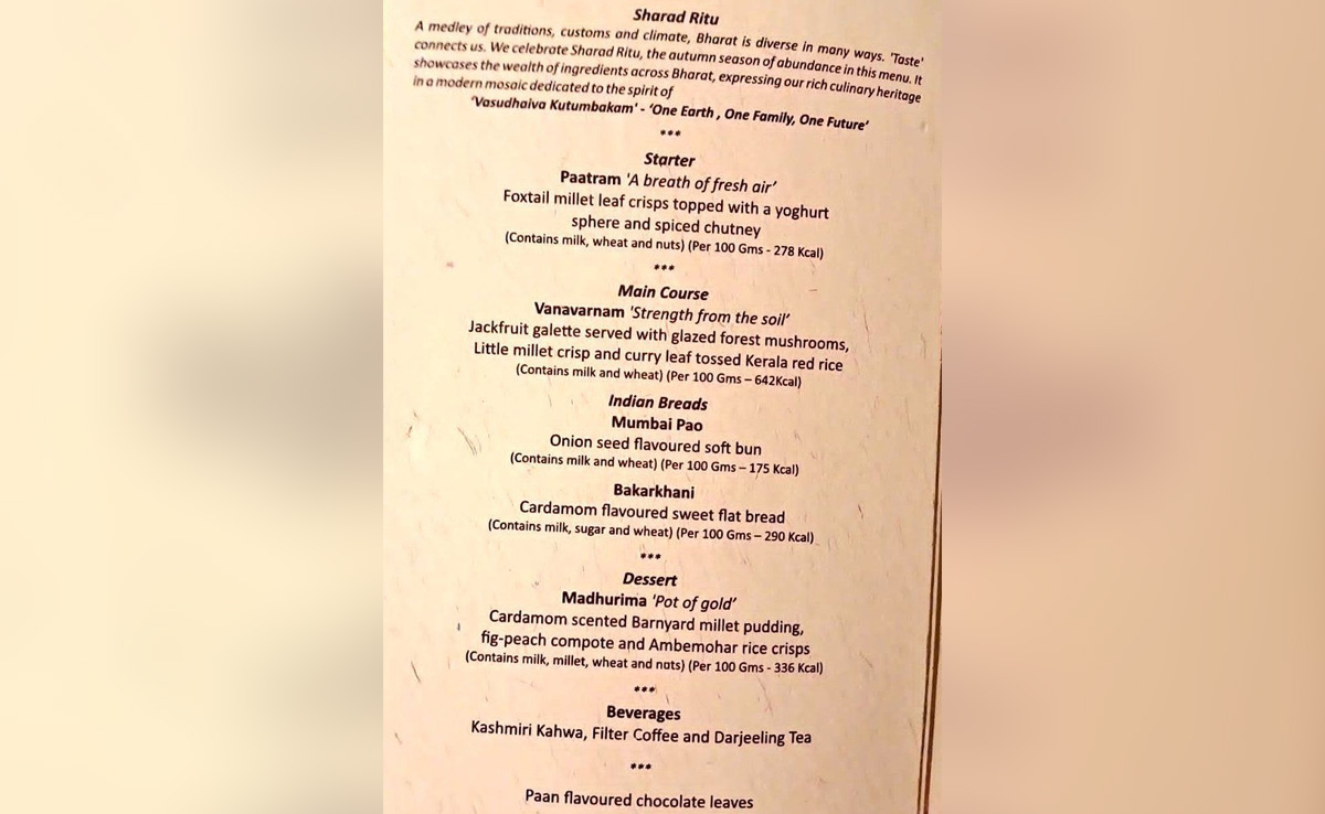 "A medley of traditions, customs, and climate, Bharat is diverse in many ways, 'Taste' connects us. We celebrate Sharad Ritu, the autumn season of abundance in this menu. It showcases the wealth of ingredients across Bharat, expressing our rich culinary heritage in a modern mosaic dedicated to the spirit of 'Vasudhaiva Kutumbakam' - 'One Earth, One Family, One Future'," it read.