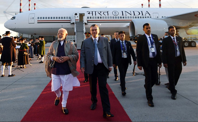 "Warm welcome to PM Shri @narendramodi in #Muenchen to attend the @G7 Summit #G7Germany #AmbHarishParvathaneni and Mrs. Nandita Parvathaneni received PM at @MUC_Airport," India's Embassy in Berlin tweeted.