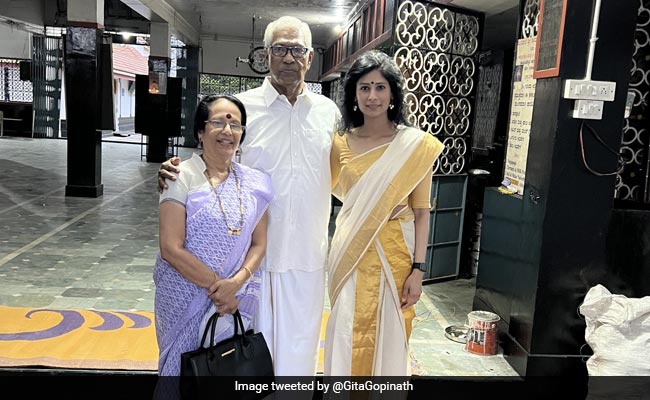 Gita Gopinath, Indian-American economist, celebrated her father's 85th birthday on May 11 and shared a photo on Twitter. In the photo, we could also see her mother. All three of them were dressed in traditional attire. While Ms Gopinath wore a white and gold saree, her father, TV Gopinath, was dressed in all white. Her mother, too, had worn a saree.