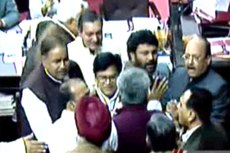 Amar Singh of the Samajawadi Party then jumped into the Well of the House and got into a scuffle with SS Ahluwalia of the BJP. Amar Singh's gesture is seen as an attempt to play to his party's Muslim vote bank.