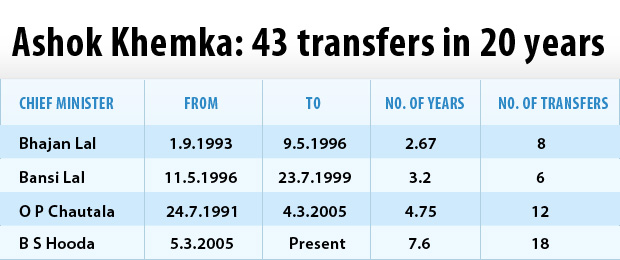 Of these, the present Bhupinder Singh Hooda, who has been chief minister since 2005, has moved him around at least 18 times. It was this last transfer that put Mr Khemka in the headlines. The opposition Indian National Lok Dal, the party of Mr Hooda's predecessor Om Prakash Chautala, quickly jumped down the government's throat, saying Mr Khemka was transferred only because he was making "revelations".