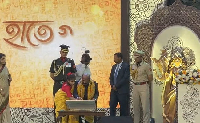 West Bengal Governor CV Anand Bose performed 'Hatey Khari', a ritual to teach the Bengali alphabet to a child, on the occasion of Saraswati Puja on Thursday in presence of Chief Minister Mamata Banerjee and other dignitaries.