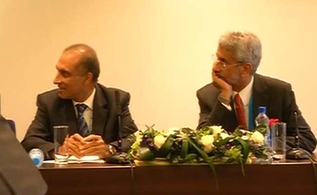 The foreign seretaries of India and Pakistan at a briefing on the bilateral meeting between the Prime Ministers of the two countries in Russia's Ufa.