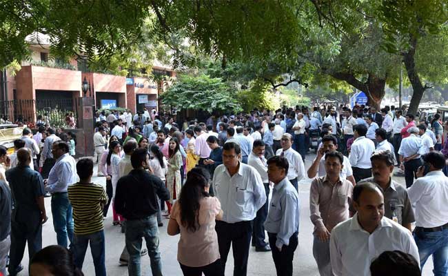 Employees come out of their offices after an earthquake in New Delhi on Monday, October 26, 2015. (Press Trust of India photo)