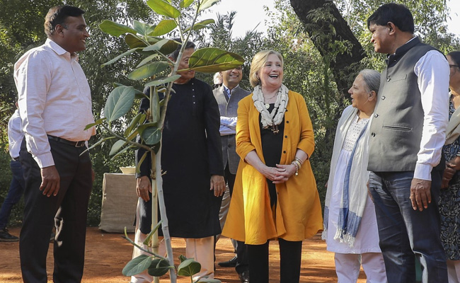 Along with Ms Clinton, floral tribute was also paid by Varun Mehta of the Torrent Group, whose Foundation, along with the Ahmedabad Municipal Corporation, has created a memorial for Ms Bhatt at the site.