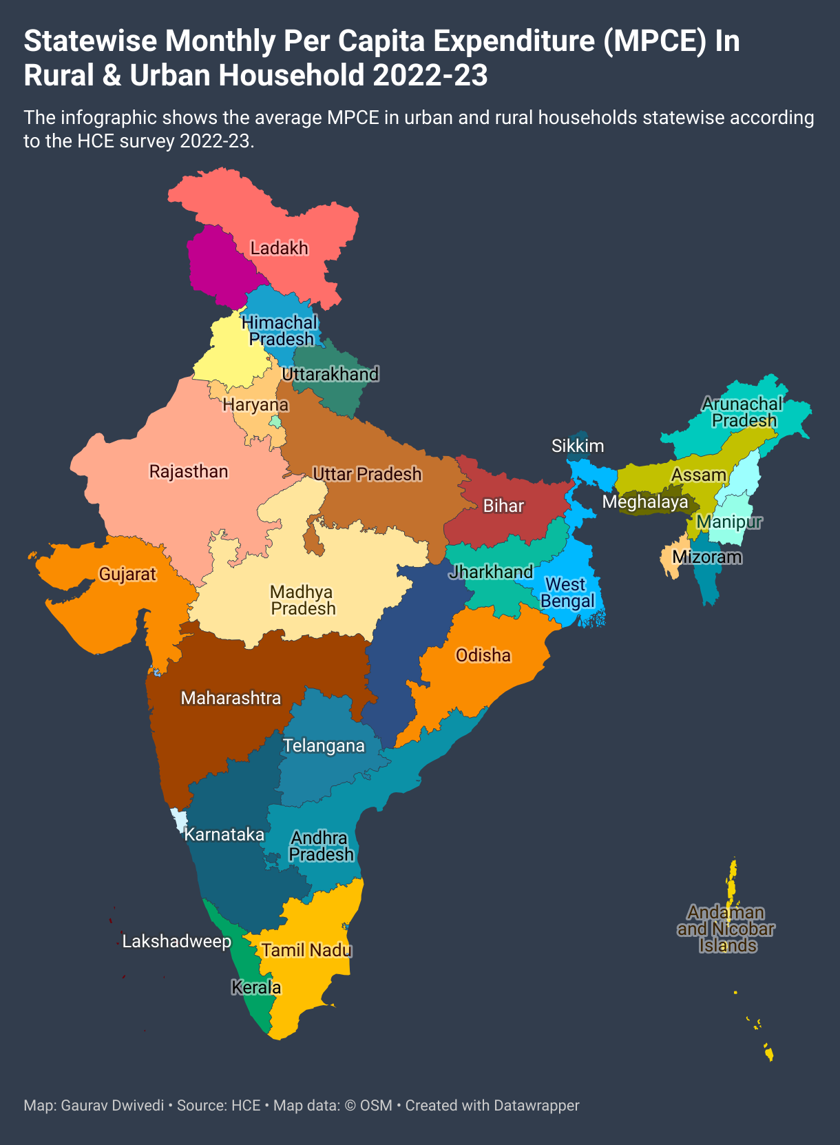 Despite the overall increase, a significant urban-rural divide persists. Urban households consistently spend more than their rural counterparts across all fractile classes. For instance, the top 5 per cent of urban households have an average MPCE of Rs 20,824, nearly double the Rs 10,501 for the top 5 per cent in rural areas. Even among the lowest 5 per cent, urban households spend Rs 2,001 compared to Rs 1,373 in rural areas.