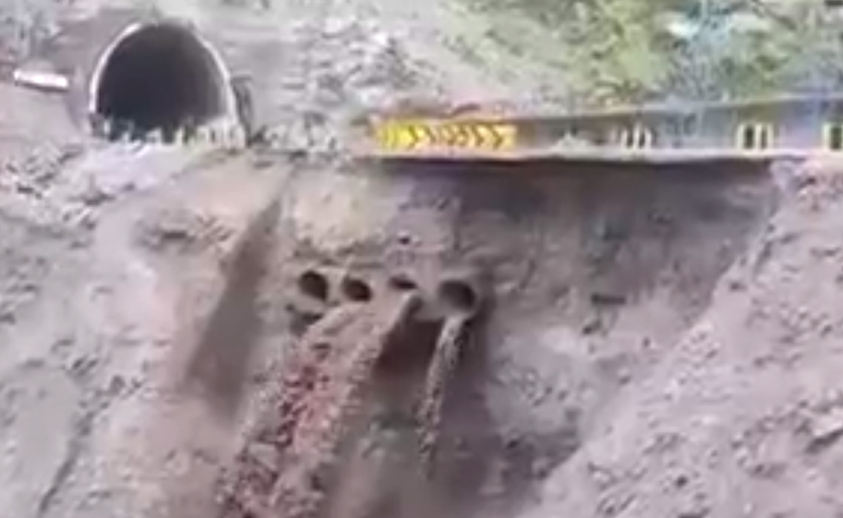 The road connecting two tunnels on the national highway was washed away after landslides, triggered by heavy rain, occurred in several areas of the Ramban district.