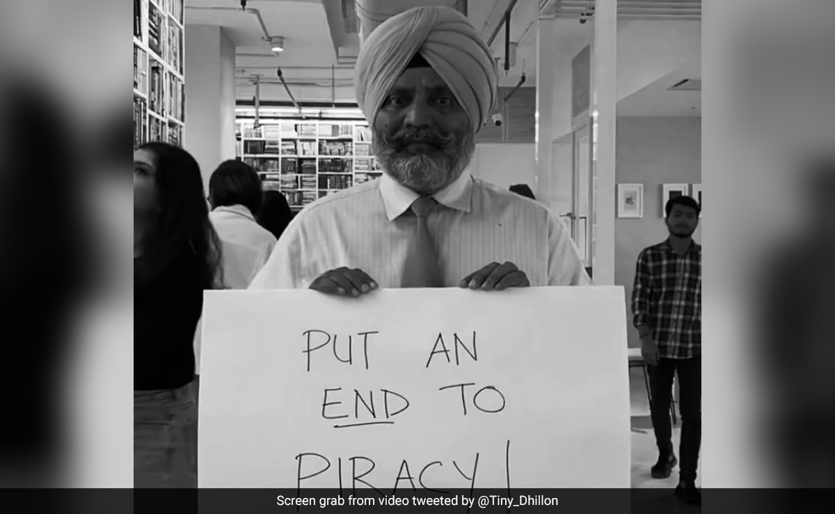 In the clip, Lt Gen KJS Dhillon (Retired) is seen holding multiple placards. He alternates between them throughout the two-minute video, pleading with viewers to "put an end to piracy!"