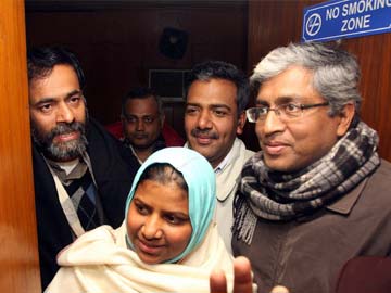 AAP leaders Rakhi Bidlan, Ashutosh, Yogendra Yadav after their meeting at Press Club in New Delhi on Tuesday.