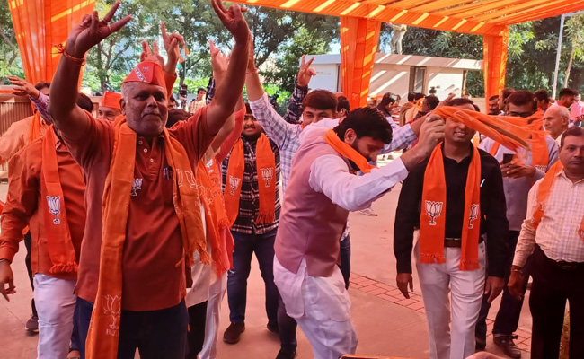 BJP workers show the victory sign as they were seen singing "NaMo NaMo".