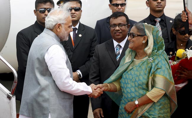 Prime Minister Narendra Modi shakes hands with Bangladesh's Prime Minister Sheikh Hasina at Shahjalal International Airport in Dhaka June 6, 2015.(Reuters)