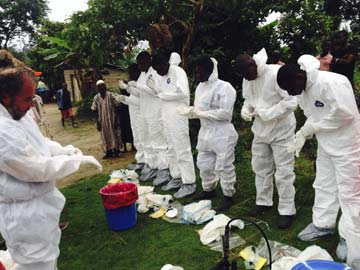 Volunteers prepare to remove the bodies of people who were suspected of contracting Ebola and died in the community in the village of Pendebu, north of Kenema in Sierra Leone.