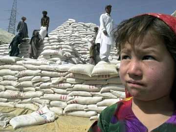 An Afghan refugee girl stays in front of wheat bags donated by United States for starving and displaced Afghans.
