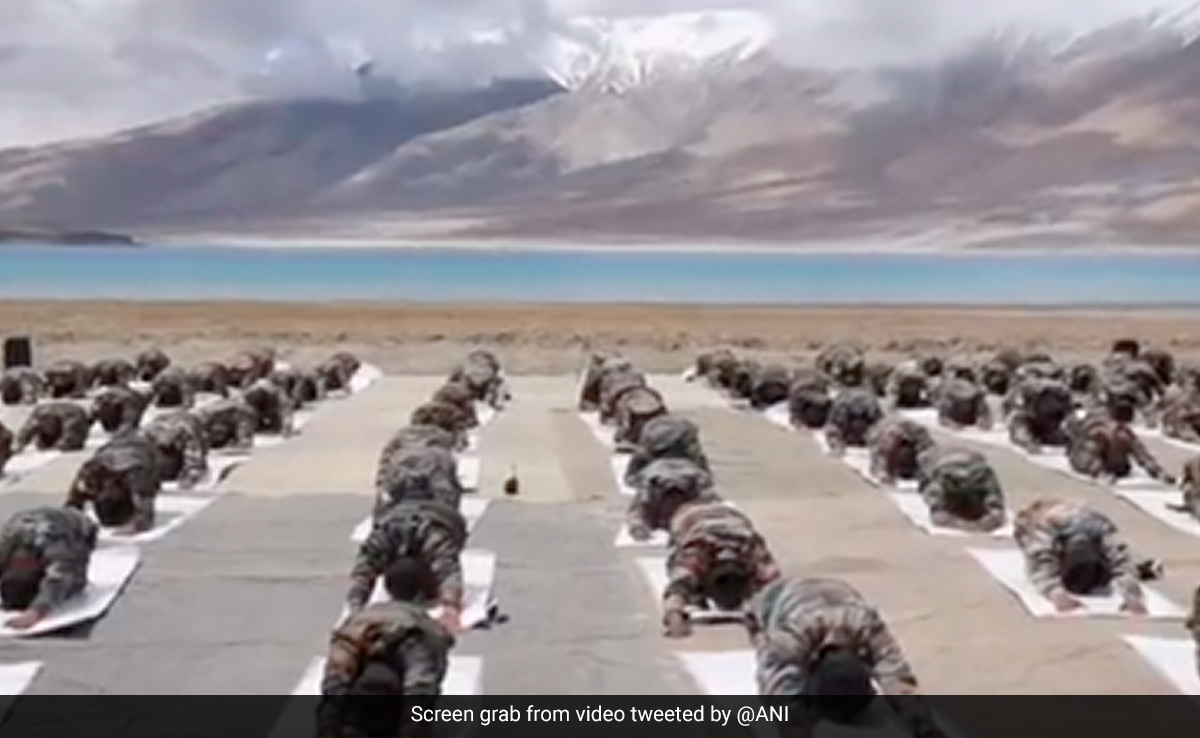 Indian Army personnel on Wednesday performed Yoga at Pangong Tso Lake in Ladakh on the occasion of the 9th International Yoga Day.