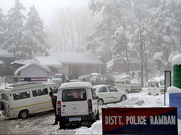 Stranded vehicles at Jammu-Srinagar highway due to snowfall in Ramban district of Jammu and Kashmir.